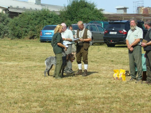 Na stejných zkouškách dcera Dara – Hessi od Vavřineckého rybníka obdržela dvě 3, zbytek 4, získala 91 bodů a 1. cenu. Musím upozornit, že její majitel fenu přihlásil 2 dny před zkouškami a kompletní výcvik všech disciplín vodních prací začal a dokončil během 1 dne, tj. v pátek, den před zkouškami. Hessi je velmi chuťová, pracovitá a nadaná fena.